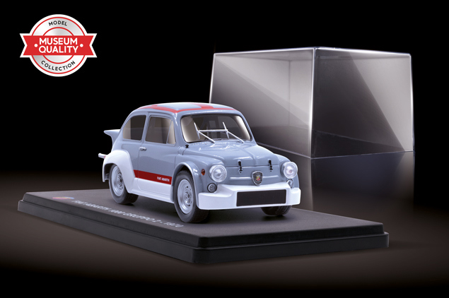 Riscopri i modelli Abarth più iconici di sempre in riproduzioni perfette in metallo, presentate su una elegante base da esposizione e teca in crystal.