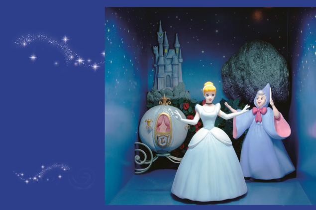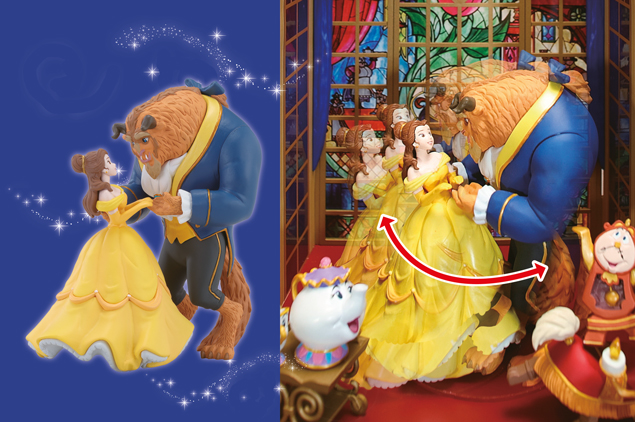 Posizionati sopra una pedana rotante, Belle e la Bestia ballano il valzer al ritmo del carillon.