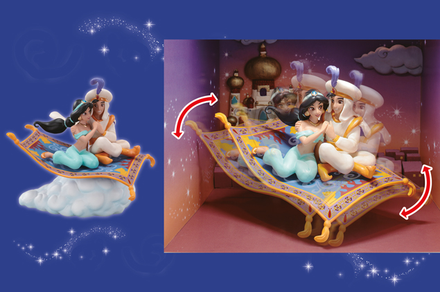 Aladdin e Jasmine a bordo del magico tappeto si godono la libertà. Il panorama sullo sfondo lascia senza fiato, con il palazzo, la città, gli uccelli in volo e una splendente luna piena.