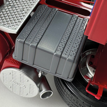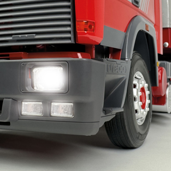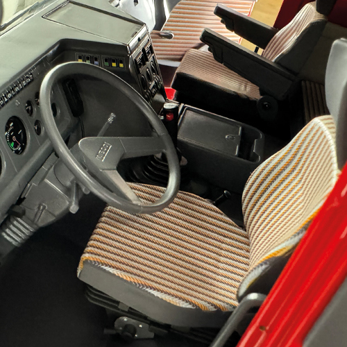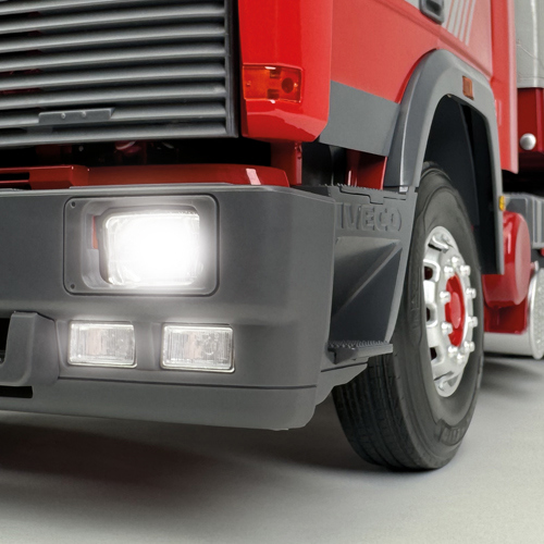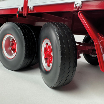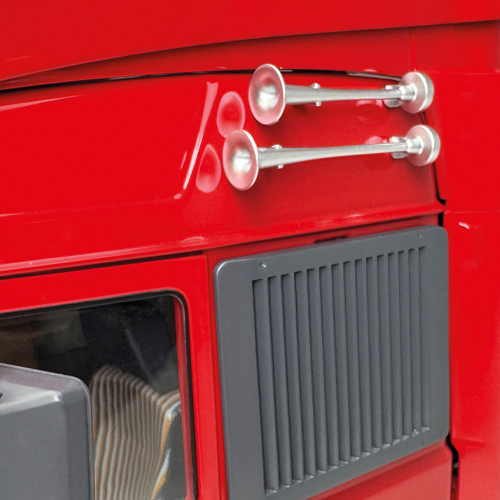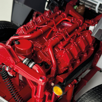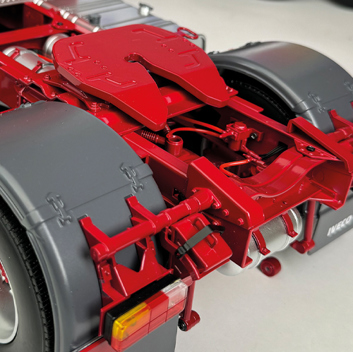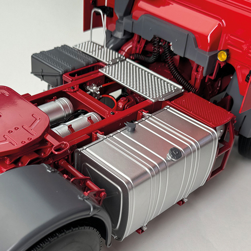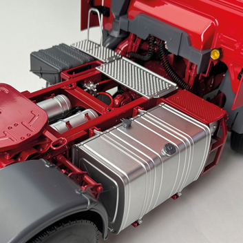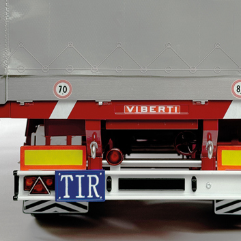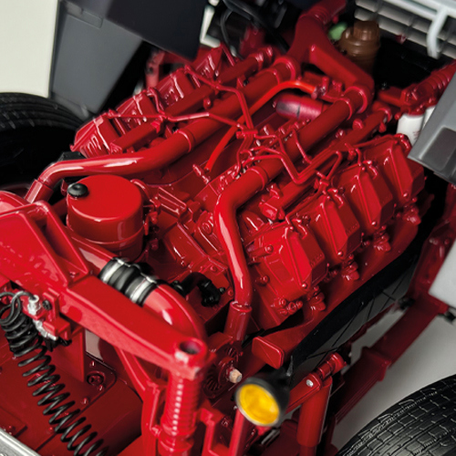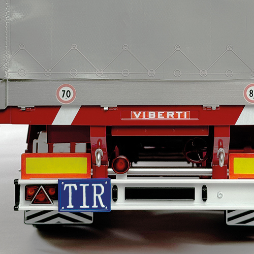 Un inedito capolavoro di modellismo in scala 1:12, nella versione top di gamma con il potentissimo motore V8 da 480 cavalli del 1989, completo di rimorchio telonato a tre assi e con l’inconfondibile livrea rossa a bande grigie, gialle e blu.